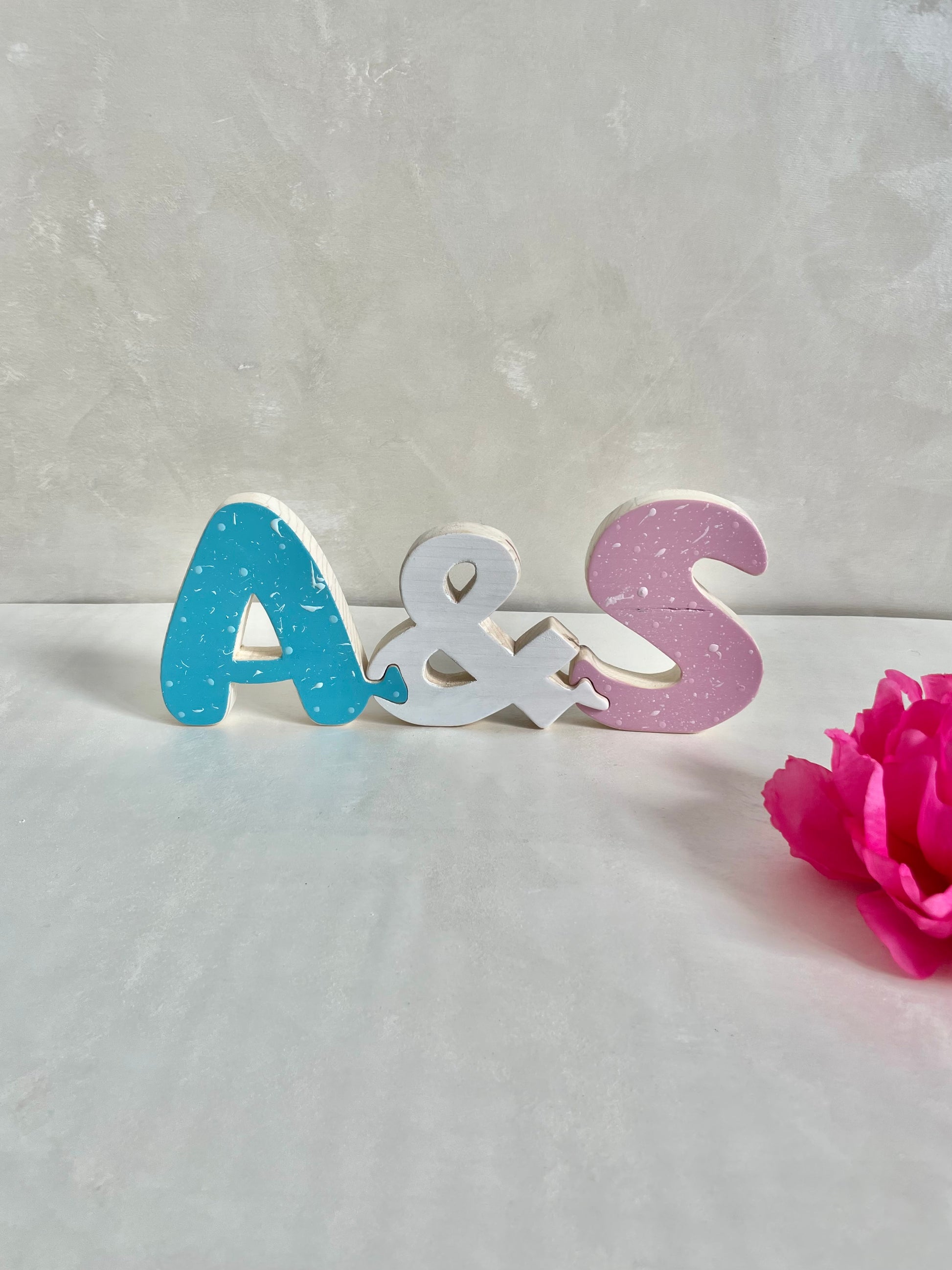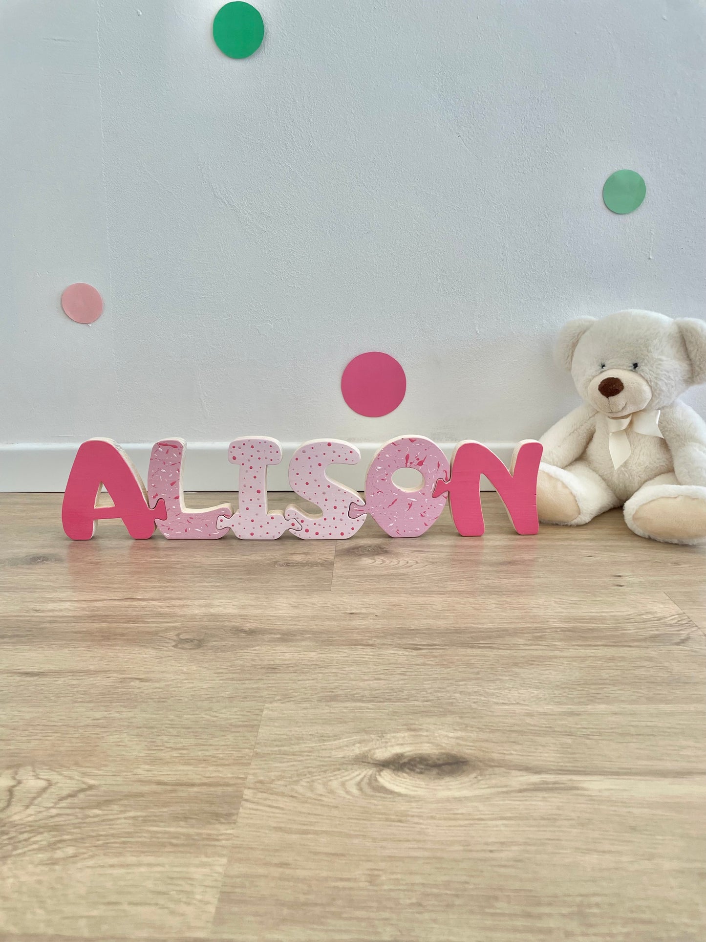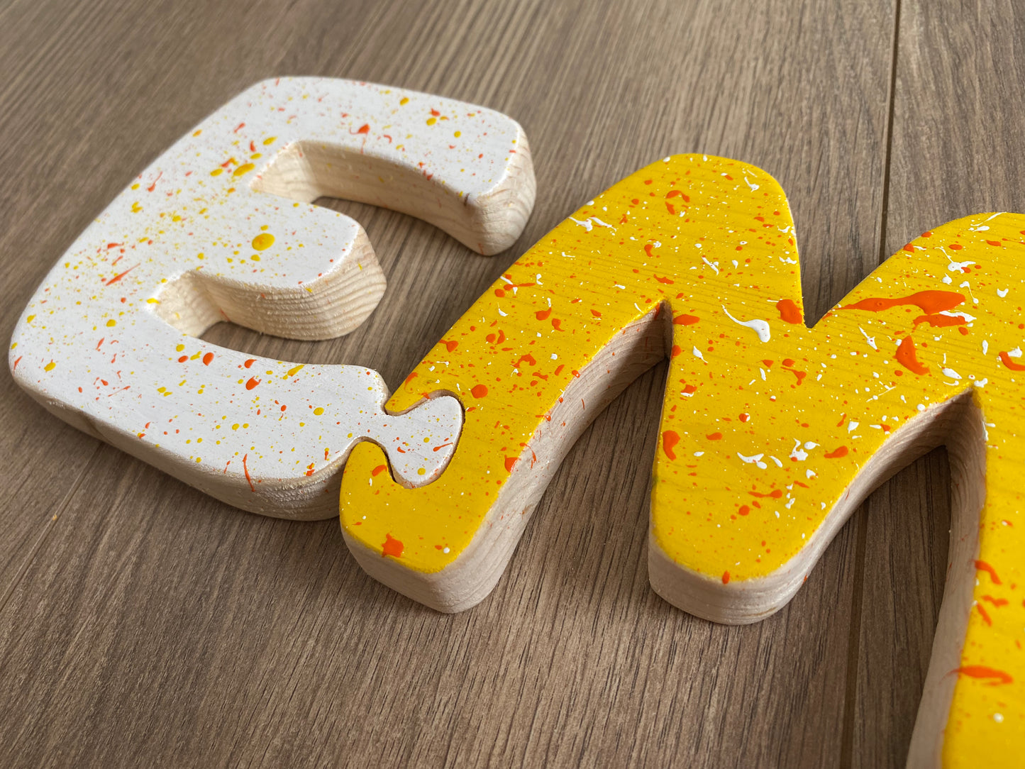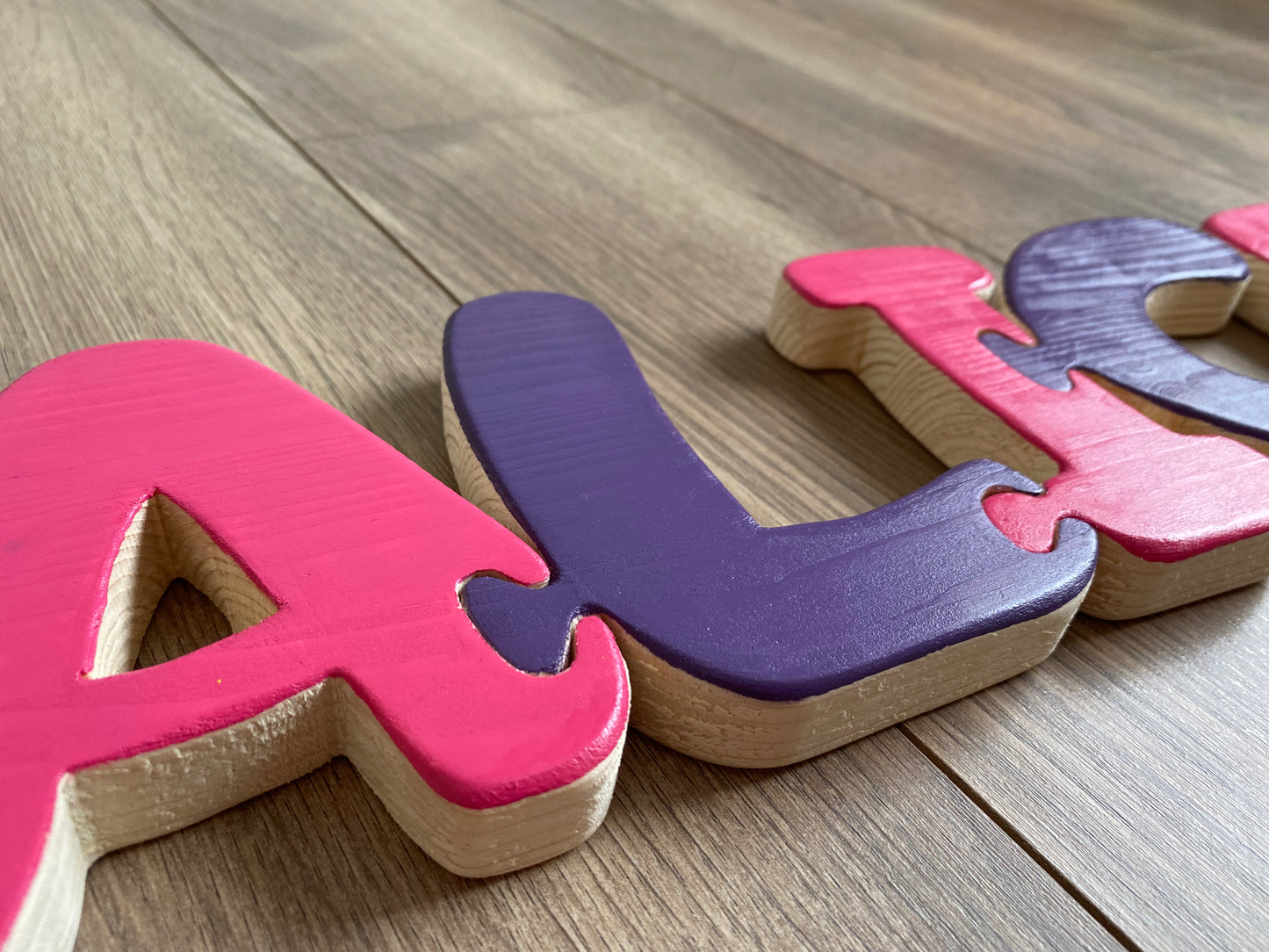 Le lettere incastrine sono realizzate interamente a mano con legno di abete e dipinte con vernici atossiche a base d'acqua, sicure per l'ambiente e per i bambini.